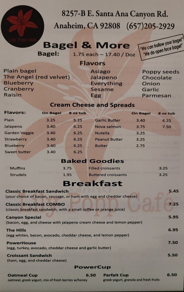 Welcome to LilyPopp Café, a delightful hidden gem located in Anaheim Hills, serving a scrumptious array of bagels and sandwiches. This family-owned café prides itself on fresh, in-house creations, offering a variety of unique bagels, including options like Jalapeno and Asiago, alongside delectable filled croissants. The charming ambience and enthusiastic staff add to the café’s inviting atmosphere, making it an ideal stop for a cozy meal or a quick takeout.